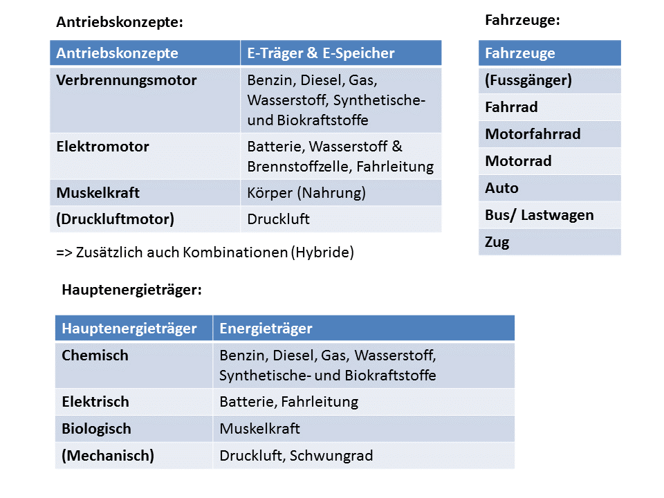 In der folgenden Darstellung sind alle, meiner Meinung nach, wichtigen Antriebskonzepte, Fahrzeuge und Hauptenergieträger dargestellt.