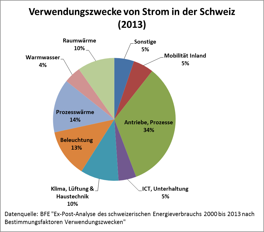 Da Strom sehr vielseitig einsetzbar ist, wird er häufig als „Premium-Energie“ bezeichnet. Er lässt sich in sehr viele andere Energieformen umwandeln und für viele Anwendungen nutzen. Grosse Nutzungsbereiche in der Schweiz sind, wie in der folgenden Grafik ersichtlich, die Bereiche