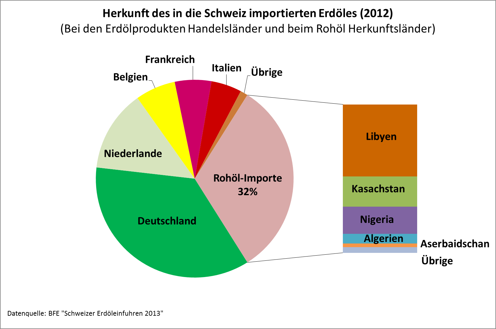 Der grösste Teil, des 2012 in der Schweiz „verbrauchten“ Erdöles, wurde in Form von Erdölprodukten aus EU-Ländern importiert. Bei diesen Erdölprodukten weiss man leider nicht welches das ursprüngliche Förderland war. Nur die 32% in Form von Rohöl importierten Erdöles lassen sich nach Herkunftsländer aufschlüsseln.