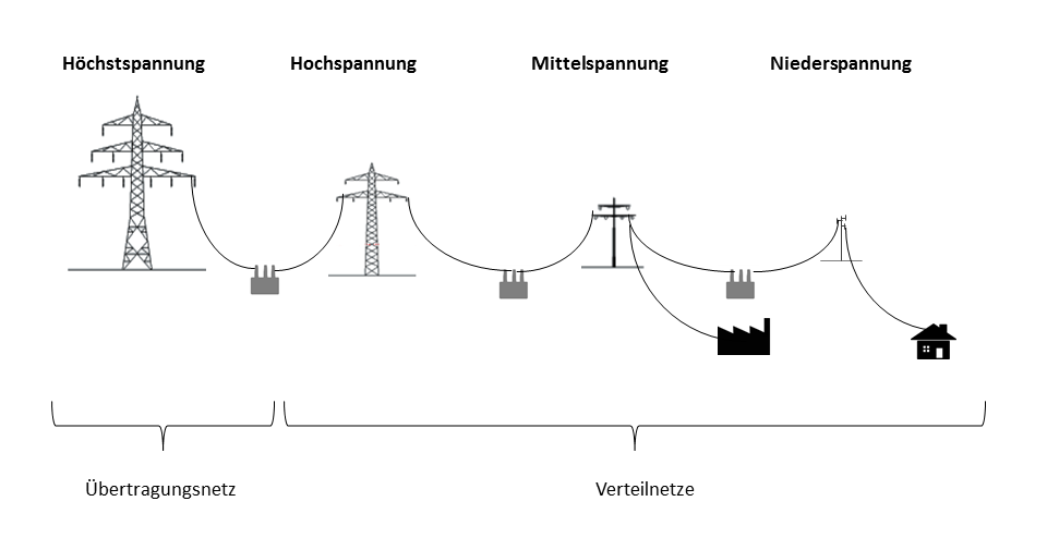 Das Stromnetz in Europa und somit auch der Schweiz ist, wie in der folgenden Grafik ersichtilch, in vier Netzebenen aufgeteilt. Die unterschiedlichen Netzebenen werden durch Transformatoren miteinander verbunden.