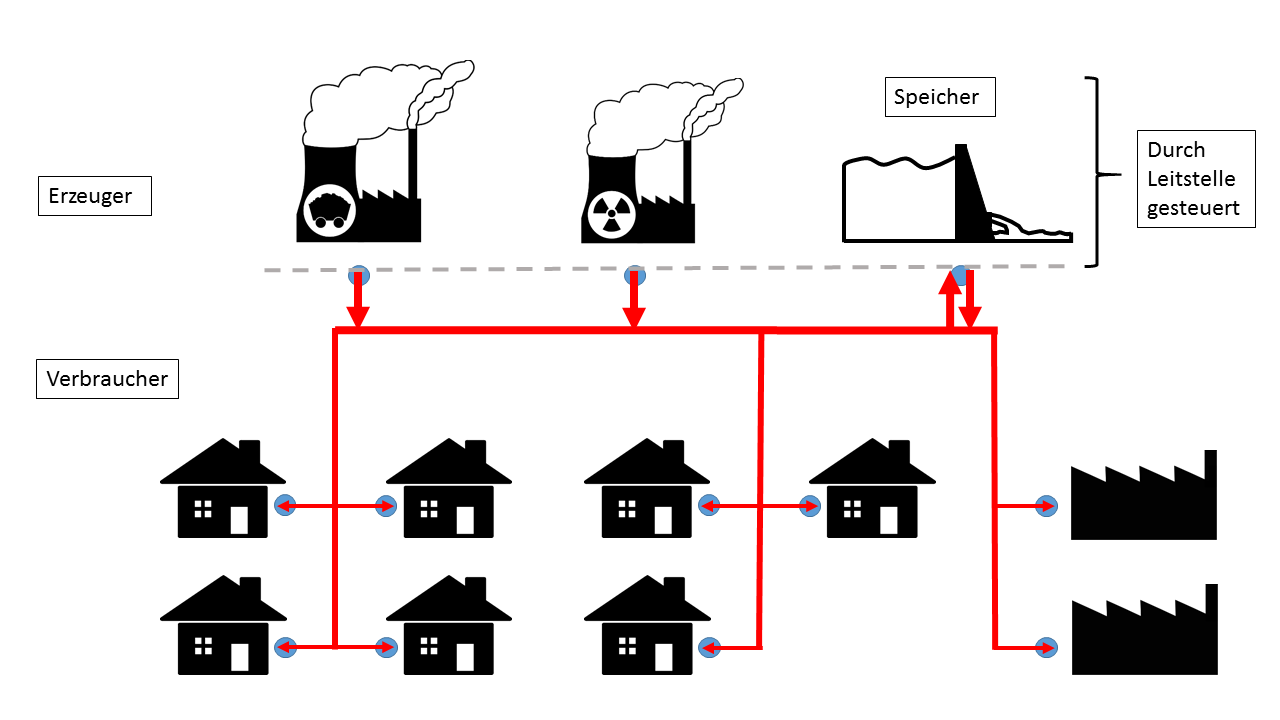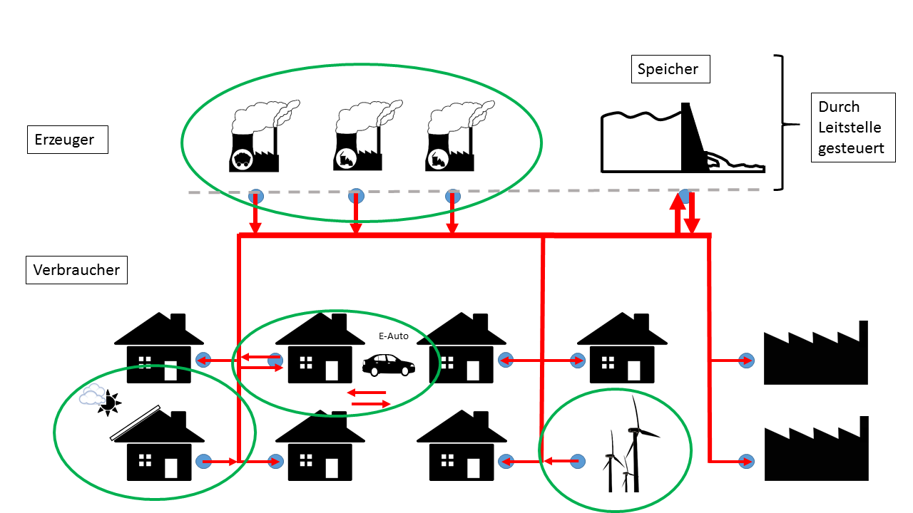 In der folgenden Grafik ist die bisherige Situation im Stromnetz dargestellt. Wichtige Punkte sind: